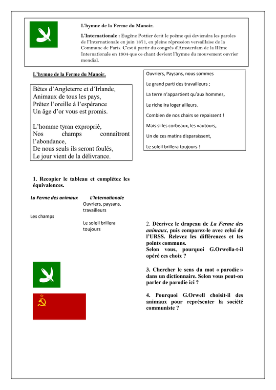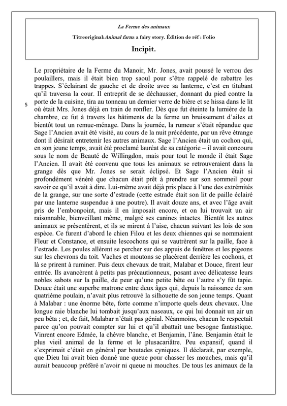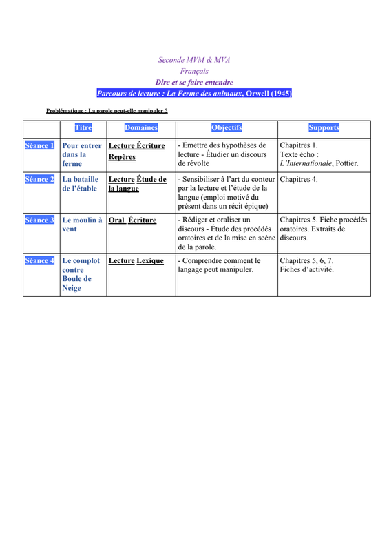 Deux animaux menacent de quitter la ferme car ils ne supportent plus les conditions de vie et le travail qu’impose le fermier. Imaginez le discours que leur adresse M. Jones pour les retenir et les convaincre des avantages de la vie à la Ferme du Manoir.2. Formuler des pistes de lecture :