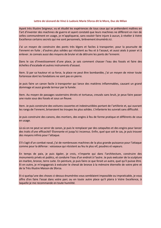 Lettre De Léonard De Vinci À Ludovic Marie Sforza Dit Le More