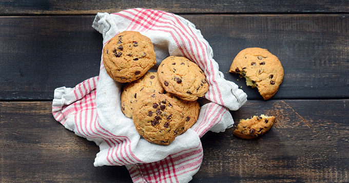 Cookies faciles – Ingrédients de la recette : 85 g de sucre semoule, 85 g de beurre, 100 g à 150 g de pépites de chocolat, 1/2 sachet de levure chimique, 1 sachet de sucre vahiné